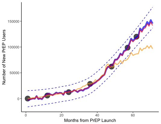 Here the outcome N is the cumulative number of people initiating PrEP in month t based on the popularity of Google searches as score Google(t). To assess the validity of using Google Trends to predict the future number of people on PrEP, we can fit the model based on users from 2012-2015 (orange) or 2012-2016 (red) so we can see how closely the predictions hit to the actual number of users in 2016 and 2017.